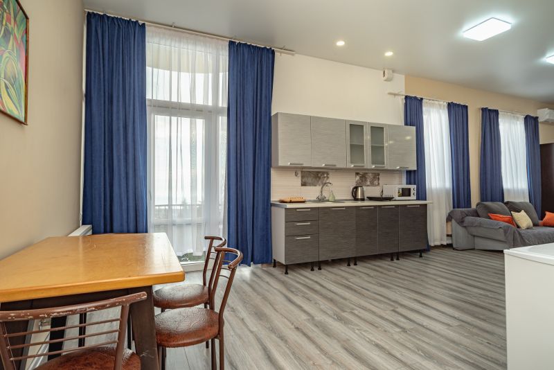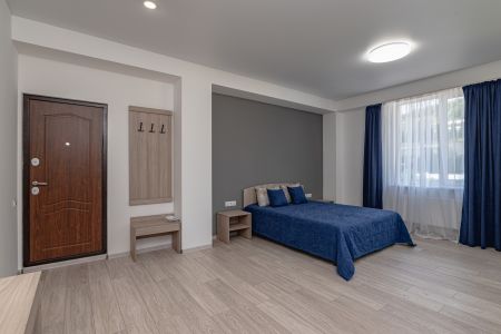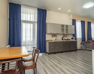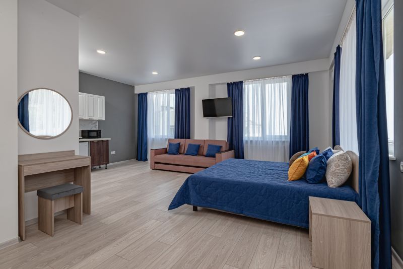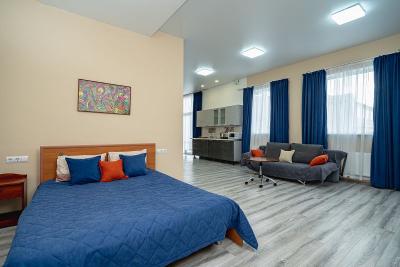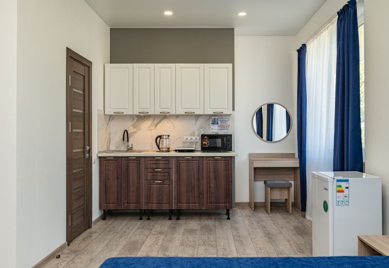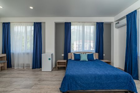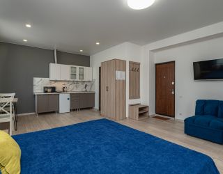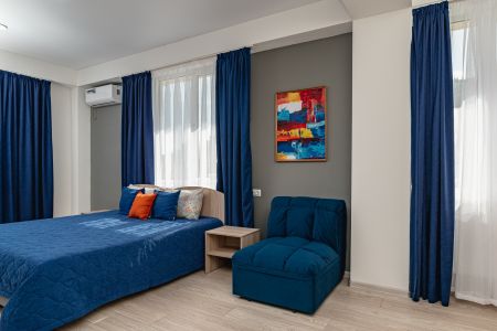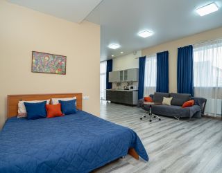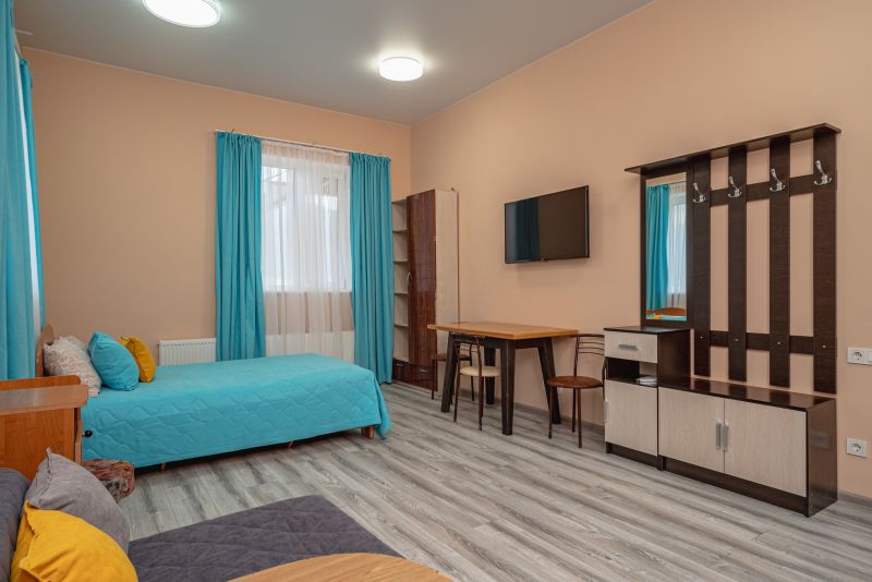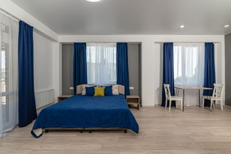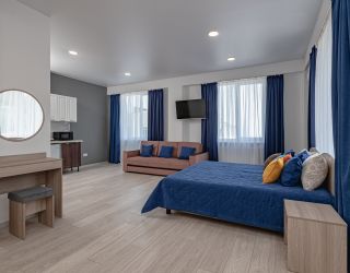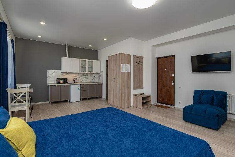 Отель занимает четырехэтажный корпус с небольшим благоустроенным двором. Все апартаменты полностью оборудованы мебелью и техникой, необходимой для отдыха с комфортом. Оснащены удобные спальные места, функциональные пространства для приготовления еды, обеденные зоны со столом и стульями. В комнатах большие окна, добавляющие пространства и света, а также балконы или террасы с панорамными видами моря или гор.
